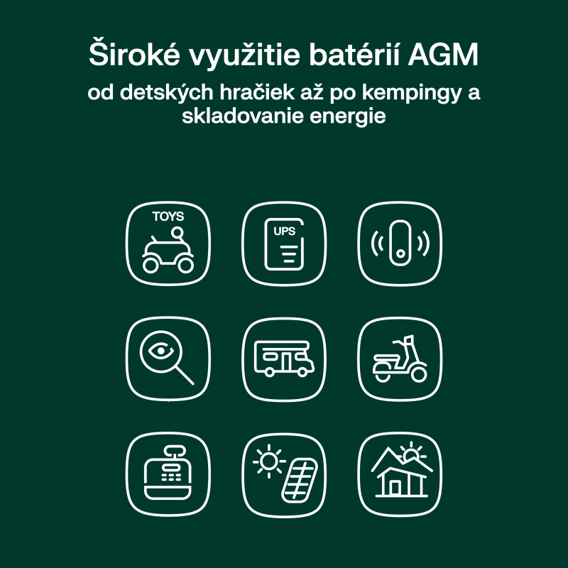 Batéria AGM je batéria na uloženie energie, určená pre široký rozsah komerčných aplikácií. Môže napájať elektrickou energiou hračky, ale tiež výstražné systémy. Batéria AGM, pričom je tiež srdcom každého UPS.