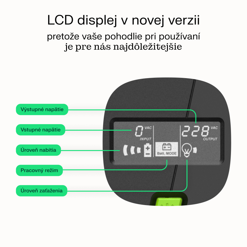 Záložný zdroj UPS má LCD displej, ktorý informuje o mnohých dôležitých parametroch prevádzky a špeciálnu aplikáciu, ktorá uľahčuje používanie a kontrolu zariadenia. V novej verzii záložných zdrojov sme zlepšili a znížili jas obrazovky, aby bol čo najčitateľnejší a najpohodlnejší pre používateľa.