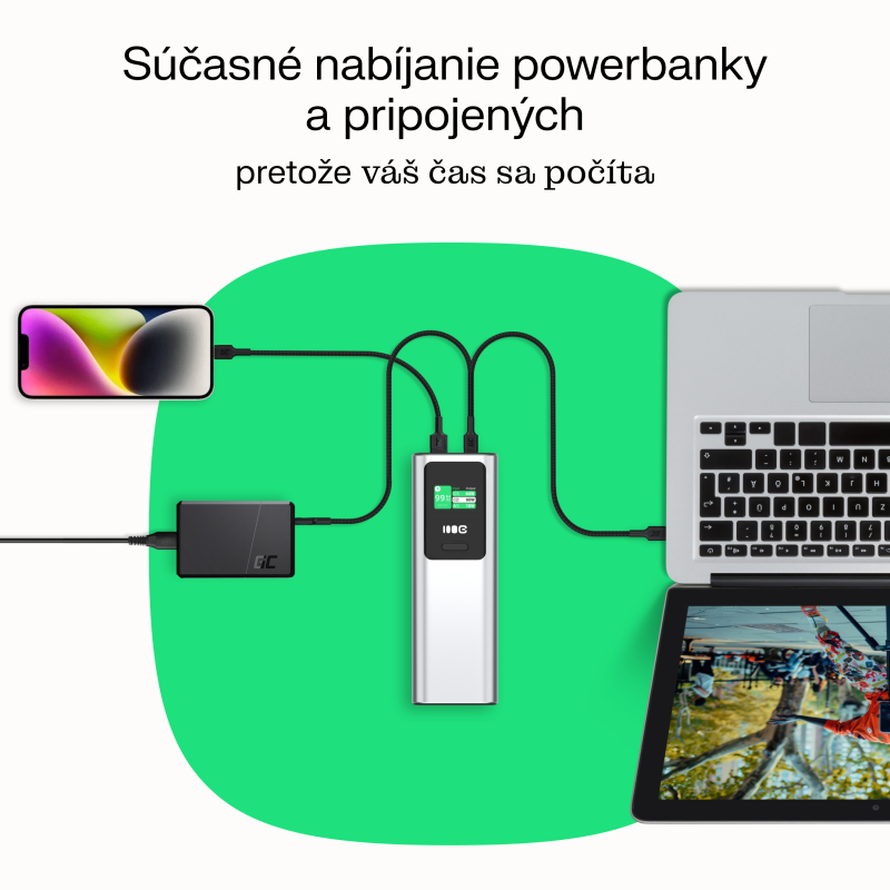 • Vybavený portami USB-C a USB-A – powerbanka Greencell umožňuje rýchle nabíjanie širokej škály zariadení, poskytujúc pohodlie a univerzálnosť v každej situácii.