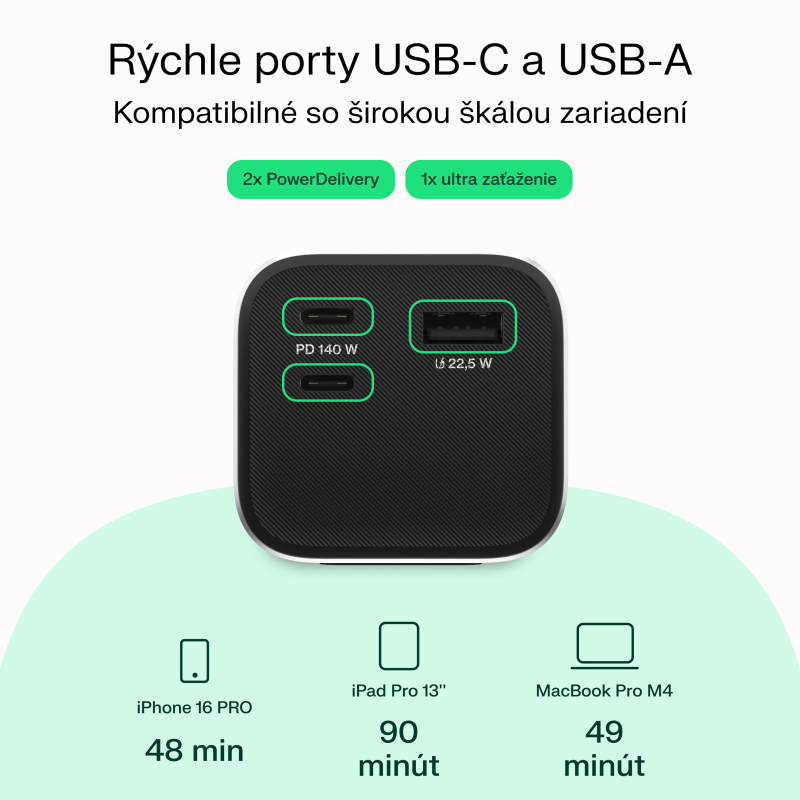• Obrovský výkon 140 W – PowerPlay Ultra powerbanka s výkonom 140 W môže súčasne nabíjať aj dva laptopy a jej pôsobivá kapacita umožňuje viacnásobné napájanie vašich zariadení.
